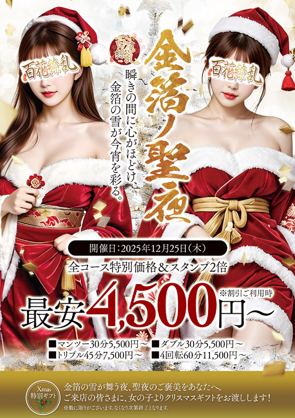 12/25(木)限定!サンタ美女と過ごす煌めきの一夜♡全コース特別価格&スタンプ2倍、最安4,500円〜!“クリスマスギフト”プレゼント🎁※なくなり次第終了。 -